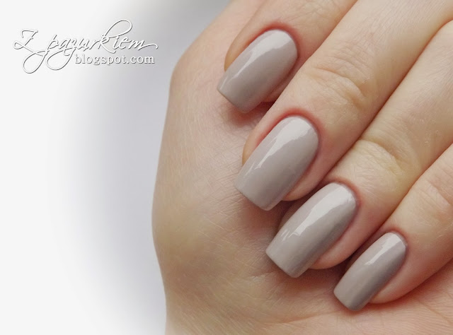 Lakier przyciągnął moją uwagę od samego początku, ponieważ bardzo lubię beże. Nie jest to jednak typowy beż. Dość mocno "zaciąga" szarością, więc na paznokciach daje nieco siny efekt ;) Mimo wszystko bardzo dobrze kryje już przy dwóch warstwach, choć musimy uważać ponieważ jest to jeden z tych lakierów, o których można powiedzieć, że mają rzadką konsystencję. Nie pozostawia smug i prześwitów.
