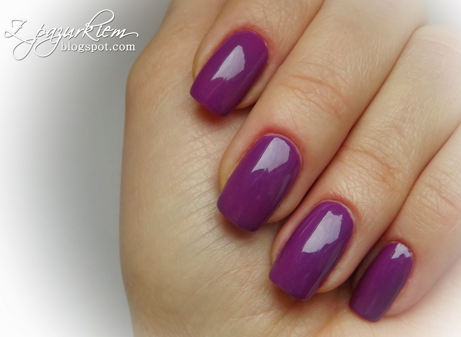 Ten lakier zrobił istną furorę. Zanim pojawił się dziś na blogu, zagościł już na paznokciach mojej mamy, mamy mojego chłopaka i moich ;) Jest pięknym, głębokim, śliwkowym fioletem, o dość niespotykanym odcieniu. Nie potrafię porównać go do niczego innego. Niestety, zdjęcia i tak nie odzwierciedlają tego, jaki jest naprawdę... :) Poza kolorem ma piękne, kremowe wykończenie i bardzo dobrą pigmentację. Dwie cieńsze warstwy wystarczą, aby zupełnie pokryć płytkę. Na zdjęciach poniżej możecie zobaczyć go bez topu, a mimo wszystko pięknie błyszczy. Oczywiście po pewnym czasie staje się delikatnie matowy, ale nawet to nie odbiera mu uroku.