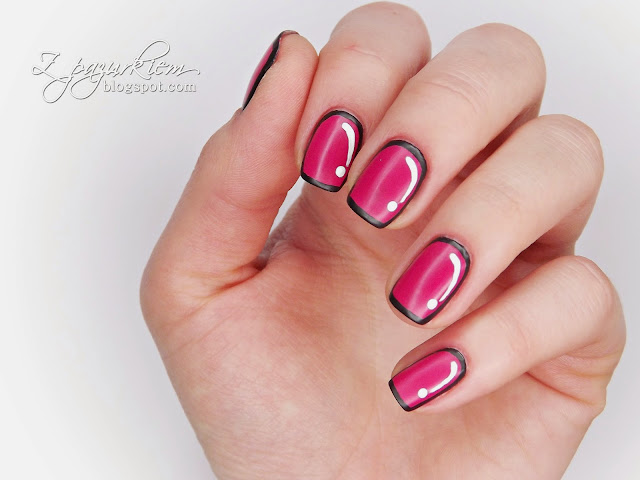 Zdobienie, które dziś zobaczycie jest zdobieniem dość popularnym. Sama jednak nigdy takiego nie robiłam i miałam ochotę sprawdzić jak będzie prezentował się na moich paznokciach. Mowa o tzw. cartoon nails, czyli pazurkach kreskówkowych ;) Cała filozofia polega tu na obrysowaniu płytki czarną farbką lub lakierem oraz nadaniu mu charakterystycznego białego "błysku". Na koniec warto też sięgnąć po matujący top coat, ponieważ akurat tego typu zdobienia o wiele lepiej prezentują się w takim wykończeniu. Bazą mojego zdobienia był recenzowany ostatnio KOBO #59 playfull pink (nawet nazwa pasuje do zdobienia!), na którym wykonałam opisane wyżej zdobienia czarną i białą farbą akrylową Eclair. Matowe wykończenie jest zasługą matującego top coatu od My Secret.