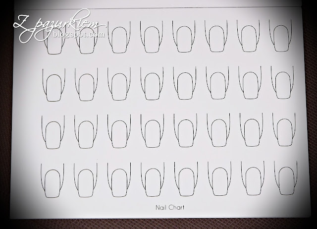 Albumy Nail Charts mają format A5. Jak widzicie na zdjęciu, mój album ma numerek 2. Producent oferuje bowiem trzy notesy, różniące się kształtem płytki paznokcia. Numer 1 zawiera paznokcie o kształcie migdała, a nawet szpica, numer 2 to pazurki kwadratowe, numer 3 - okrągłe. Sama zdecydowałam się na dwójkę, ponieważ jest to kształt najbardziej zbliżony do mojej naturalanej płytki ;)
