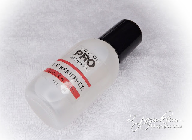 Do usunięcia lakieru hybrydowego Mollon wykorzystujemy UV Remover Quick & Easy, w którego składzie znajdziemy m.in.: aceton, wodę, olejek rycynowy, cyklopentasiloksan (prawdopodobnie zapobiegający nadmiernemu odparowywaniu wody), czy perfumy. Podobnie do pozostałych płynów ma mocną, słodką woń.