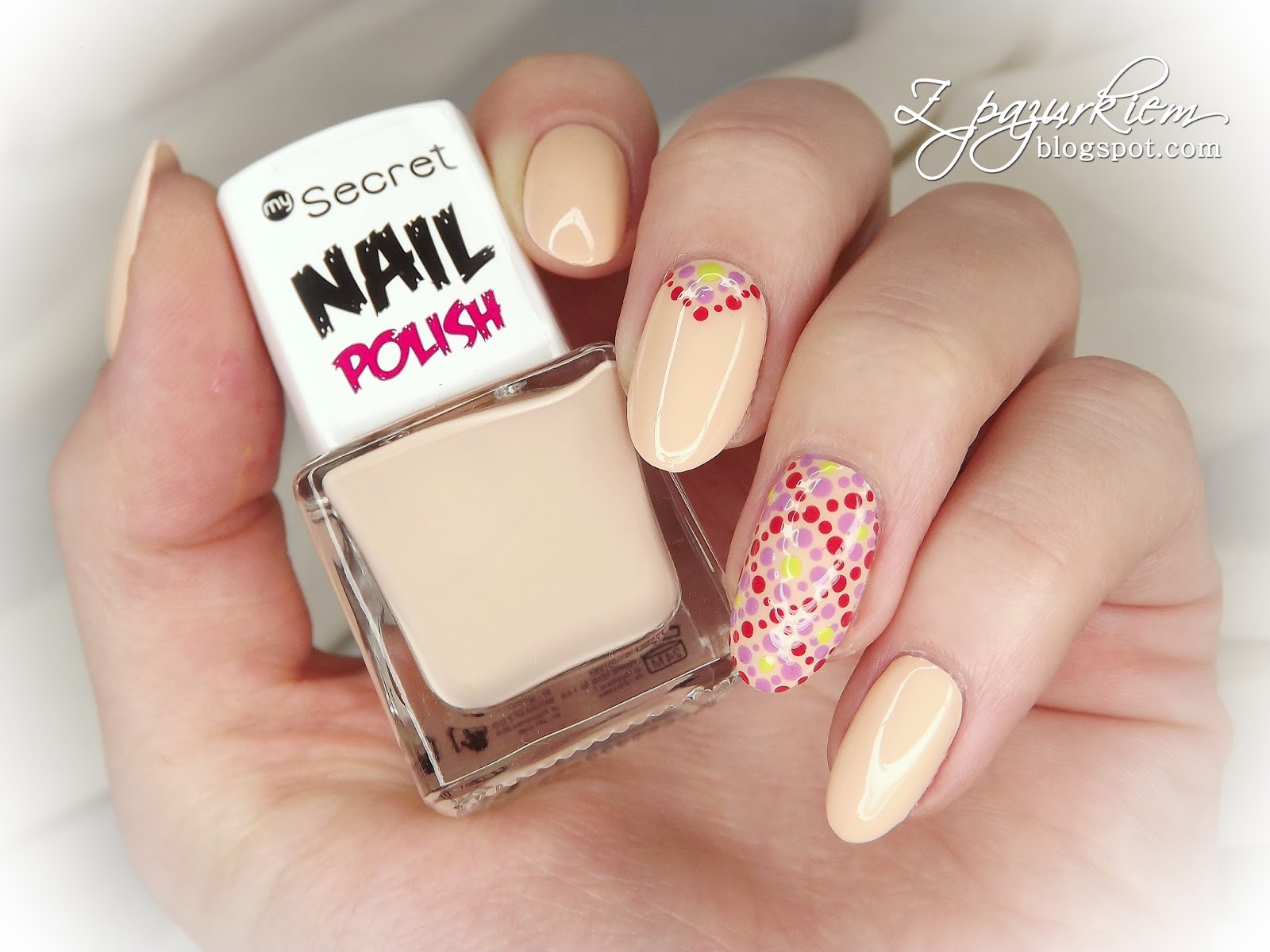 Jasne kolory zdecydowanie pobudzają moją wzorkową wyobraźnię, więc pokusiłam się o moje pierwsze zdobienie w kropeczkowym stylu, który ostatnio zawojował Internet :) Do wykonania kropek wykorzystałam lakiery My Secret :)