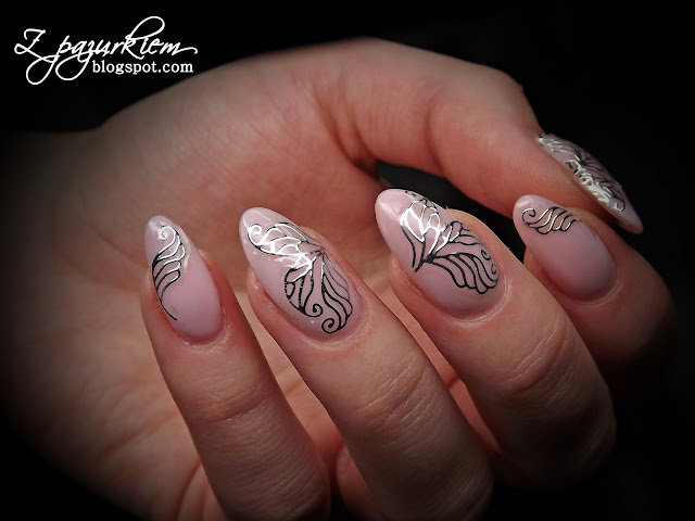 Do zdobienia, które zobaczycie poniżej użyłam trzech rodzajów naklejek. Dwie średniej wielkości, które przypminały mi skrzydła motyla i które niestety są tylko w dwóch egezmplarzach :) Do tego dwie malutkie na palcu wskazującym i małym oraz jedną największą, która zajęła niemal cały paznokcieć kciuka (który mam dość spory ;)) Bazą zdobienia są moje pazurki żelowe (a raczej ich pozostałości w postaci resztek Indigo Easy shape cover oraz dwóch warstw hybrydy Semilac 051 French beige milk) :)